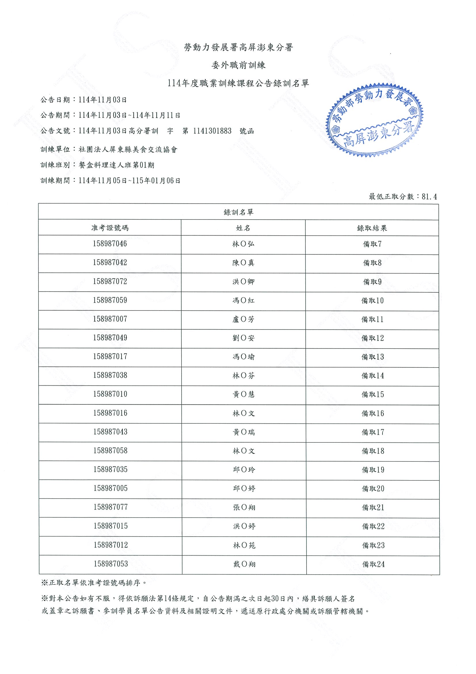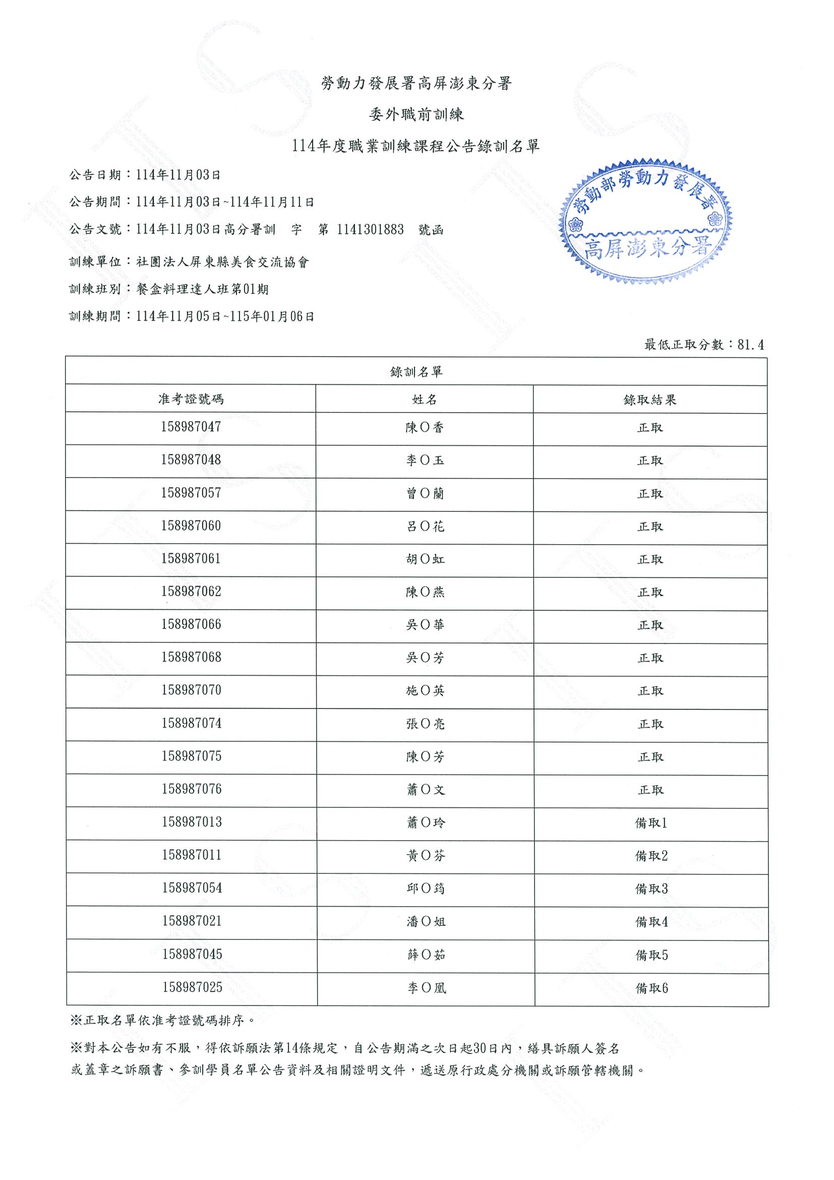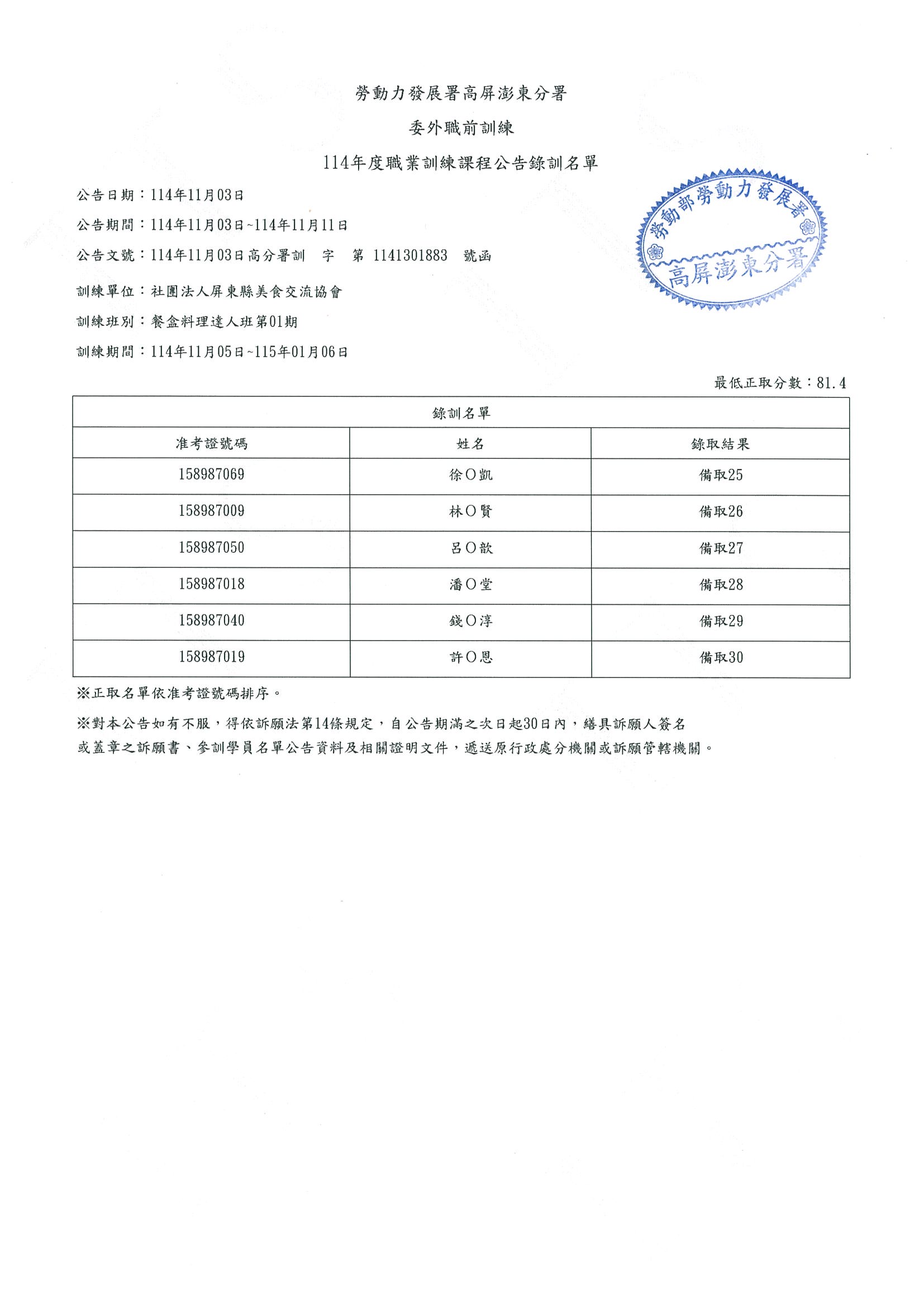 114年度職業訓練餐盒料理達人班-錄訓名單