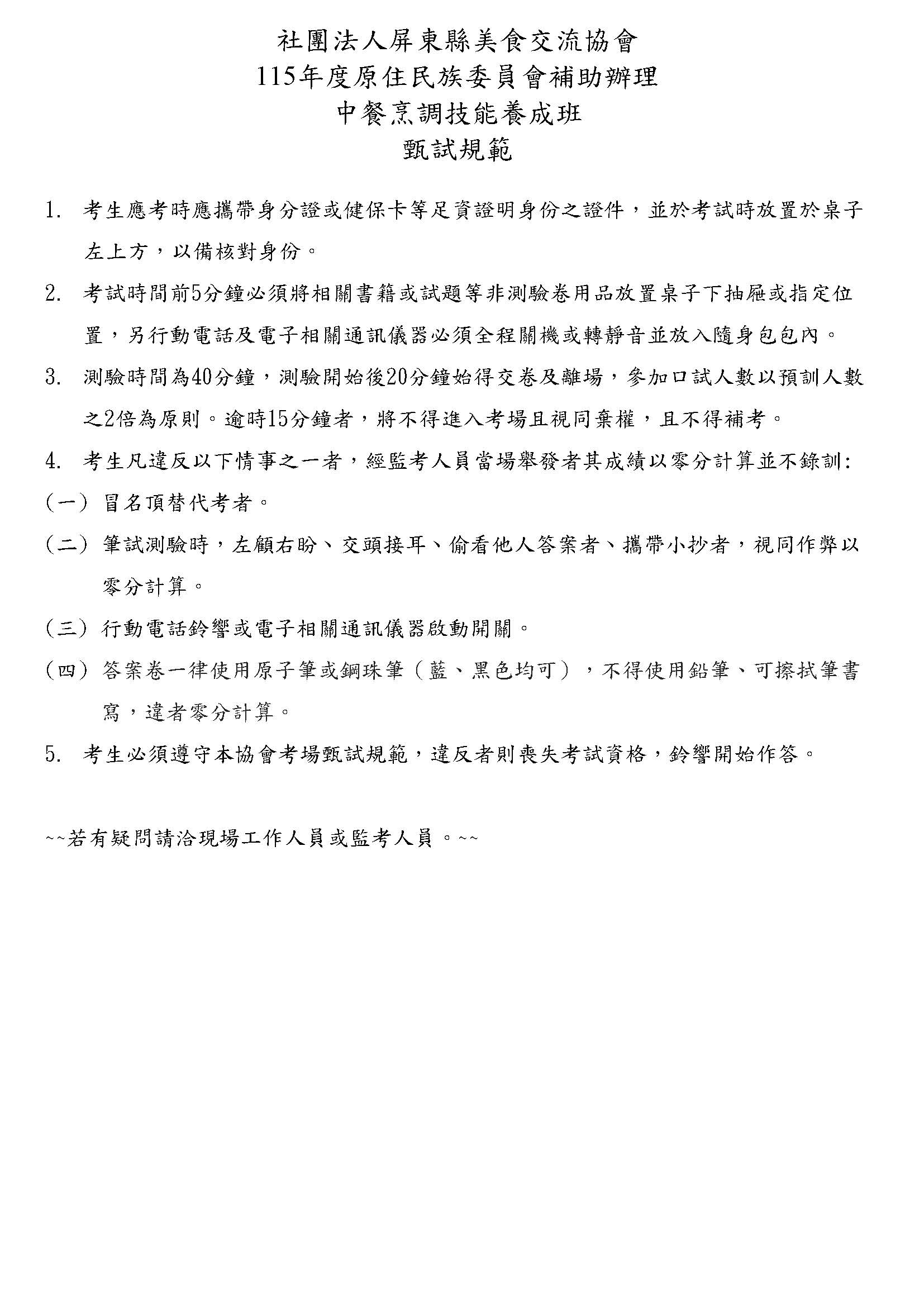 115年度原住民族委員會補助辦理-中餐烹調技能養成班甄試規範